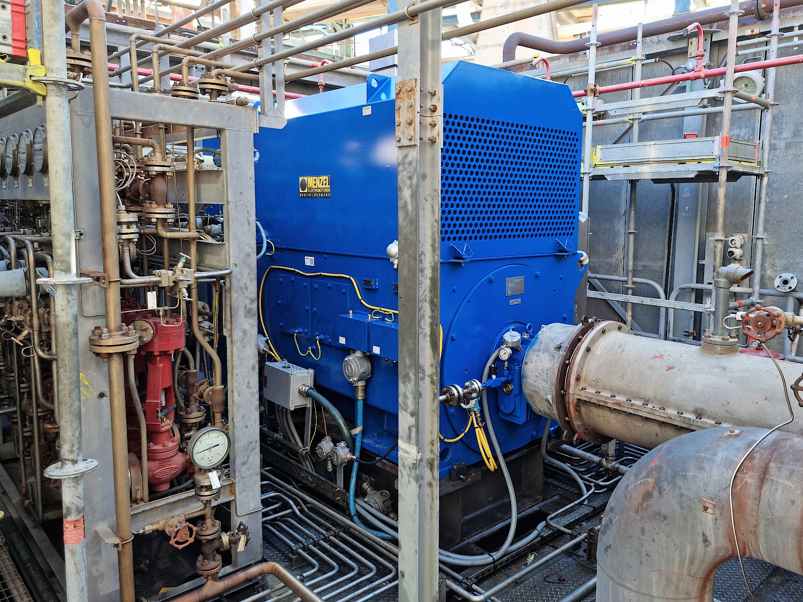 MENZEL developed a custom overpressure-encapsulated squirrel cage motor delivering 1,635 kW at 6,000 V, engineered explicitly for compressor drives in hazardous areas. Featuring robust IP 55 protection and efficient IC 611 cooling, the motor design leverages a TÜV Nord-certified construction principle. This ensures that the internal air flushing system reliably prevents any gas accumulation within the motor housing, effectively eliminating all potential ignition sources inside the unit. To simplify installation and guarantee compliance, MENZEL incorporated a specially certified terminal box for explosion protection, designed and manufactured in-house to streamline your supply chain. Each motor undergoes exhaustive TÜV testing, including full-load operation in MENZEL’s dedicated test field in Berlin, providing you with verified performance and safety before installation. Through this solution, our customer benefits from a high-performance motor that not only meets but exceeds safety and operational expectations while offering flexible, reliable, and rapid delivery.